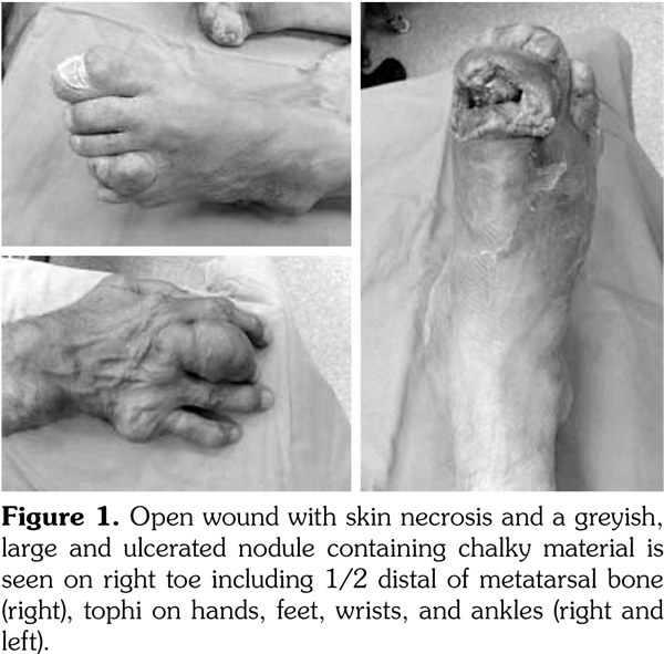 including 1/2 distal of the metatarsal bone. There was an open wound with skin necrosis with a greyish, large and ulcerated nodule containing chalky material. Besides, widespread tophi on extremities and soft tissues were noticed (Figure 1). Many joints including the nonfunctional first IPJ of right toe were deformed.
