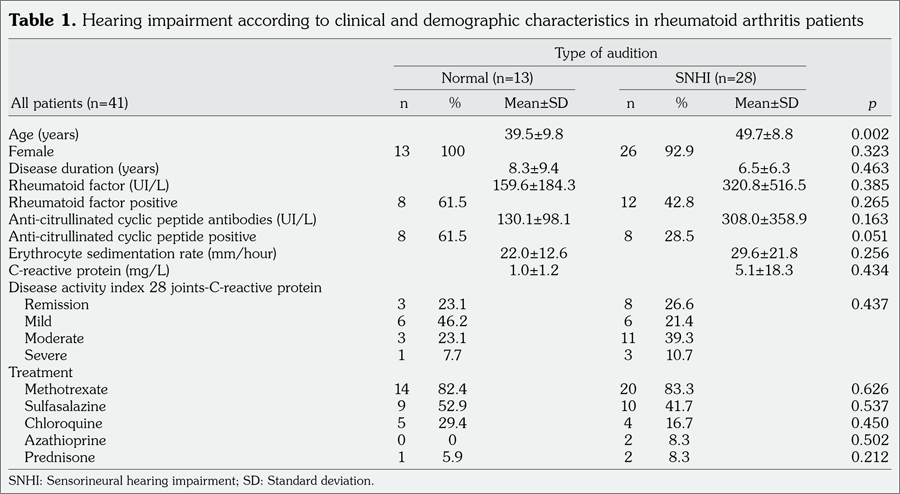 Patients and methods: A total of 41 RA patients (2 males, 39 females; mean age 46.5±10.2 years; range 20 to 63 years) with no known traditional cardiovascular risk factors were included. Routine clinical and laboratory assessments for RA patients were performed. Pure tone air (250-8000 Hz) and bone conduction (250-6000 Hz) thresholds were obtained, tympanograms and impedance audiometry were conducted. Sensorineural hearing impairment was defined if the average thresholds were ≥25 decibels. Carotid intima-media thickness was assessed and classified with a cut-off point of 0.6 mm.