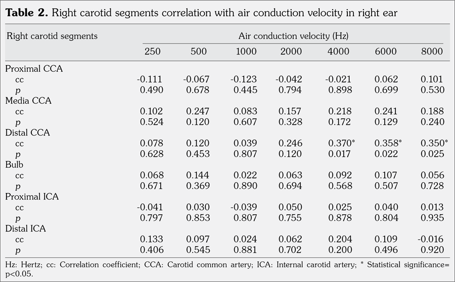 We detected a statistically significantly positive correlation between right distal CCA cIMT values and abnormal audition at 4000 Hz [correlation coefficient (cc) 0.370, p=0.017), 6000 Hz (cc 0.358, p=0.022) and 8000 Hz (cc 0.350, p=0.025)] as shown in Table 2.