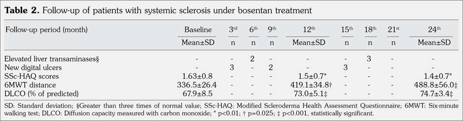 Results: Mean disease duration was 8.8±8.0 years and mean duration of digital ulcers was 29.4±6.6 months. Under the bosentan treatment, eight patients (26.7%) developed new digital ulcers; all of these patients had diffuse cutaneous SSc. Health Assessment Questionnaire scores improved after 12 months and 24 months of treatment (p<0.001). Three patients (10%) developed pulmonary arterial hypertension under bosentan treatment [two patients (6.6%) had SSc-associated pulmonary arterial hypertension and one patient (3.3%) had interstitial fibrosis-associated pulmonary arterial hypertension]. The anti-centromere antibody positive patients were predominantly classified as limited cutaneous SSc. Of the patients positive for anti-topoisomerase-1 antibodies, a high proportion was classified as diffuse cutaneous SSc. Pulmonary fibrosis was most frequent in the anti-topoisomerase-1 antibody subset. New digital ulcers developed mainly in the anti-topoisomerase-1 antibody positive patients.
