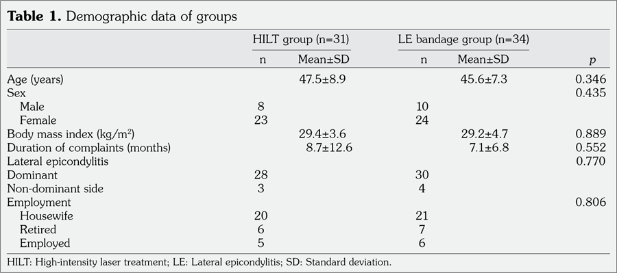 Sixty-five elbows with LE were randomized into HILT (n=31) and LE bandage (n=34) groups via coin toss. HILT lasted two weeks, whereas other patients were recommended to wear LE bandage for six weeks. Activity and resting visual analog scale (VAS), Disabilities of the Arm Shoulder and Hand, Short-Form 36 (SF-36), and hand grip strength values were recorded before and after treatment. Post-treatment evaluation was performed at the sixth week following the end of the treatment. Throughout the study, patients were discouraged to use analgesics; yet, they were allowed to use 500-2000 mg paracetamol daily if necessary. Patients were asked not to use analgesics 24 hours prior to the evaluation.