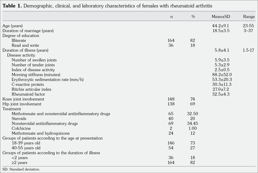 Patients and methods: The study included 200 female RA patients (mean age 44.2±9.1 years; range 18 to 55 years) and 100 age matched healthy control females (mean age 42.5±6.3 years; range 18 to 55 years). Mean duration of RA was 5.8±4.1 years. All participants were assessed by Health Assessment Questionnaire Disability Index, Numerical Rating Pain Scale, Sexual Disability Scale, psychiatric interview, Beck Depression Inventory, and Spielberger's State-Trait Anxiety Inventory.