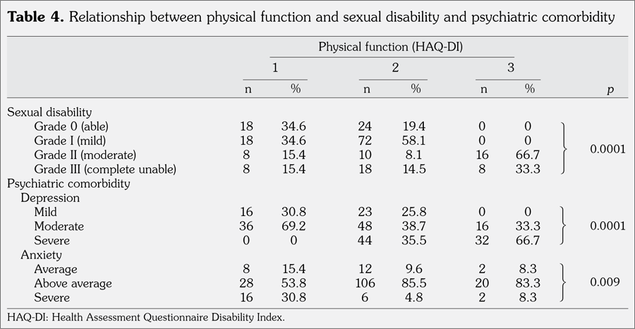 Living with pain, stiffness, fatigue, limited movement and decreased strength associated with arthritis may reduce ability for sexual expression and enjoyment. Moran(38) reported that in ~35% to 44% of patients with RA, the disease put a strain on their relationship, reduced the sexual interest due to limitation of activities and emotional changes, while ~10% of patients reported that sexual activity was almost or totally impossible. Panush et al.(39) demonstrated that in 85% of their patients, the increased disease activity with joint swelling was a major limiting factor for initiating sexual activity. Furthermore, Shahar et al.(40) showed significant correlation between sexual function index score (assessed by Malay Version of FSFI) with erythrocyte sedimentation rate (r=-0.364, p=0.009) and disease activity score in 28 joints (r=-0.268, p=0.057), patient's age (r=0.520, p<0.001), duration of marriage (r=-0.355, p=0.001), husband’s age (r=-0.460, p=0.001), age of oldest child (r=-0.449, p=0.001), and age of youngest child (r=-0.627, p<0.001). Yilmaz et al.(41) reported a strong negative correlation between total female sexual function score with disease activity scores in 28 joints, a moderate negative correlation between total female sexual function score with HAQ, BDI, visual analog scale scores, age, and morning stiffness and weak negative correlation between total female sexual function score and body mass index in females with RA. Hari et al.(42) demonstrated higher percentage of sexual dysfunction (assessed by FSFI) in females with RA which involves all dimensions of sexuality including desire, arousal, lubrication, orgasm, and satisfaction except pain. In multivariate linear regression analysis, the authors reported that swollen joints and disease activity were the independent variables associated with sexual dysfunction. In the multivariate analysis of this study, we observed that sexual disability and loss of sexual desire or satisfaction were significantly associated with physical dysfunction and psychiatric comorbidities such as depression, but not with disease activity or pain. In accordance, Costa et al.(43) reported higher percentage of sexual dysfunction (assessed by FSFI) in females with RA (79.6%); however, they showed no association of disease activity or functional disability with sexual dysfunction. Arthritis results in restriction of normal activities and might distort self-image, self-perception and self-esteem resulting in depression and anxiety and thus reluctance to share physical relationship with someone. Anxiety has been highly associated with depression in several studies.