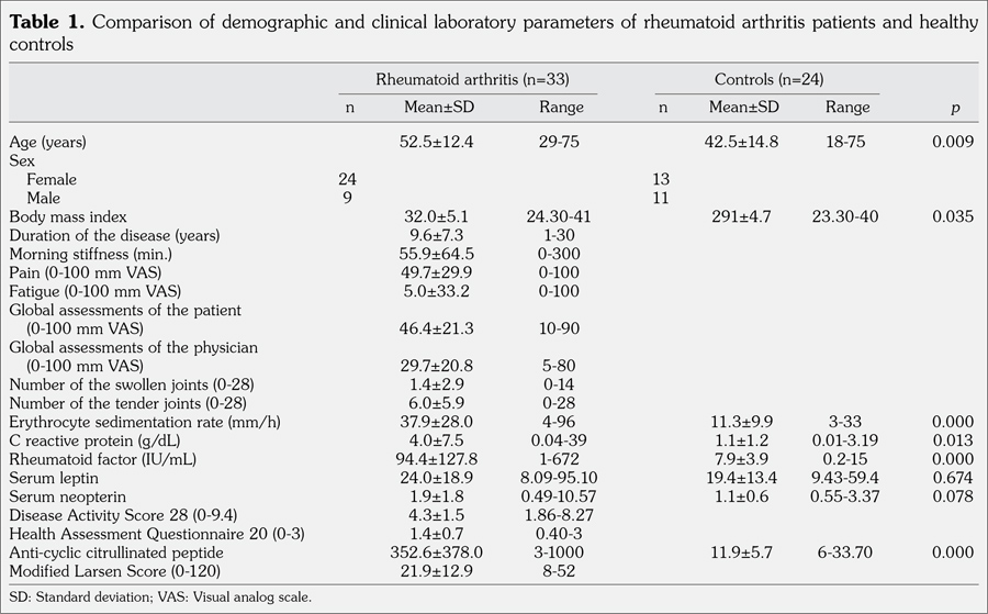 Age, sex, and body mass index (BMI) of the patients were comparable between RA and control groups (Table 1). Duration of disease was 9.57±7.29 years in the RA group. RF and anti-CCP positivity were detected in 26 patients (78.8%). The patients had low (DAS28=2.6-3.2; n=13; 39.4%), moderate (DAS28=3.2-5.1; n=12: 36.4%), and high (DAS28≥5.1; n=8: 24.2%) degrees of disease activity.