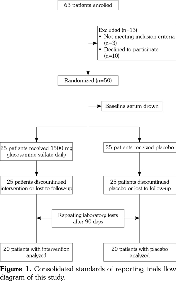 A total of 63 non-diabetic patients with OA (23 males, 40 females, mean age 64.8±8.66 years; range 53 to 81 years) were initially registered for this randomized, double blind, placebo controlled clinical trial which was performed between February 2013 and May 2014 in the Rheumatology Department of Mashhad University of Medical Sciences, Mashhad, Iran. All patients met the American College of Rheumatology criteria for the diagnosis of OA of the knee or the hip.(14,15) Patients, either diagnosed with diabetes, or with a family history of diabetes, body mass index <20 and >30 kg/m(2)), history of liver or renal disease, myocardial infarction, inflammatory diseases, pregnancy or lactation, systemic diseases that induce insulin resistance and those taking drugs that interfere in glucose metabolism including anticonvulsants, glucocorticoids and antipsychotics, were excluded. Thirteen patients were excluded on the grounds that they either subsequently declined or failed to meet our inclusion criteria. The remaining 50 patients (18 males, 32 females, mean age 63.9±6.86 years; range 50 to 79 years) were divided into two equal groups in a blind manner by computerized randomization. Both observers and the patients were blind as to the type of randomization and the drug form. After drawing serum baselines, first group received the usual dose of 1500 mg (500 mg x 3 capsules daily) glucosamine sulfate (Heaith Burst Company, Ohio, USA) for 90 days, whereas the second group received placebo capsules containing cellulose. Both groups were allowed to use analgesic medications, which they had taken before as needed. Every month, based on a random number chart, patients received boxes of 90 capsules of glucosamine or placebo from the dispenser in our center for three months and we ensured that the capsules were used fully and properly. After 90 days, laboratory tests were repeated in all patients. We excluded five patients in each group as they failed to take the drug or did not refer for follow-up. Finally, the study was completed with 40 patients (15 males, 25 females, mean age 63.8±7.64 years; range 49 to 80 years) with non-diabetic OA and body mass index within the medium range.