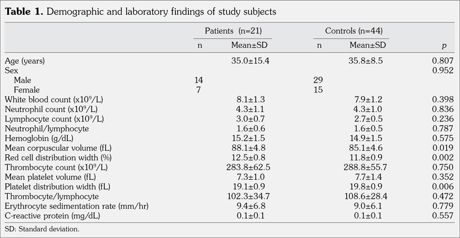 Results: No differences were noted between patient and control groups in terms of erythrocyte sedimentation rate and C-reactive protein levels, white blood cell, neutrophil, lymphocyte and thrombocyte counts, and neutrophil to lymphocyte and thrombocyte to lymphocyte ratios (all p>0.05). When compared with controls, patients had significantly higher mean corpuscular volume (p=0.019) and RDW (p=0.002) values, and a lower PDW level (p=0.006).