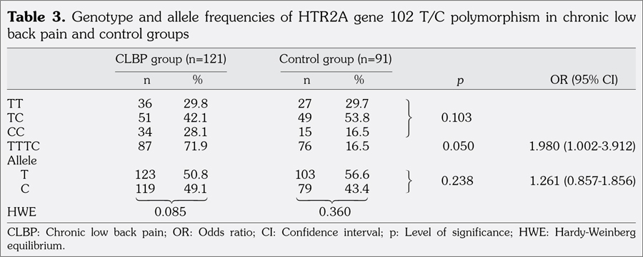In the 102 T/C polymorphism of the HTR2A gene, the base in nucleotide position 102 may be thymine (T) or cytosine (C), with three possible genotypes as TT, TC or CC. These polymorphisms were evaluated in the patients diagnosed with CLBP and the healthy controls. The genotype distribution in each group was in accordance with the Hardy-Weinberg equilibrium (p>0.05). Table 3 shows the distribution of the genotype and allele frequencies of 102 T/C in both groups. The differences were not statistically significant between the two groups (p>0.05 for each).