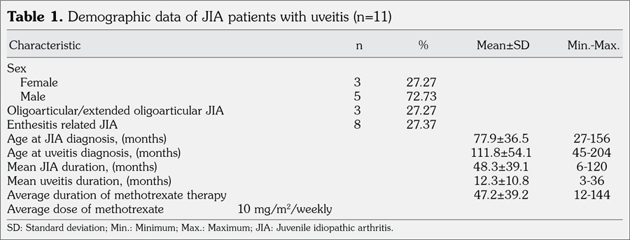 Patients and Methods: We retrospectively analyzed the data of 11 JIA patients (8 males, 3 females; mean age 14.5 years; range 9 to 18 years) with associated uveitis treated with biologic therapy. All patients were diagnosed as oligoarticular/extended oligoarticular or enthesitis-related JIA subtypes, treated with methotrexate, and had active or previous history of uveitis for which adalimumab was prescribed. We tested all patients for anti-nuclear antibody presence and human leukocyte antigen genotype. We assessed disease activity and therapy efficacy by American College of Rheumatology 50%, 70%, and 100% improvement criteria. We evaluated uveitis activity by slit-lamp biomicroscopy and recorded adverse events.