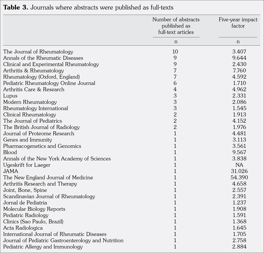 The first journal where the highest number of full-texts were published was the Journal of Rheumatology, as Hashkes et al.(3) reported. Although the official journal of EULAR is Annals of the Rheumatic Diseases, this journal ranked in second place according to publication rates following the Journal of Rheumatology. In the previous reports of adult rheumatology congresses, Arthritis and Rheumatism (it has been divided into two independent journals as Arthritis & Rheumatology and Arthritis Care & Research) ranked in first place in terms of publication rates.(11,12)
