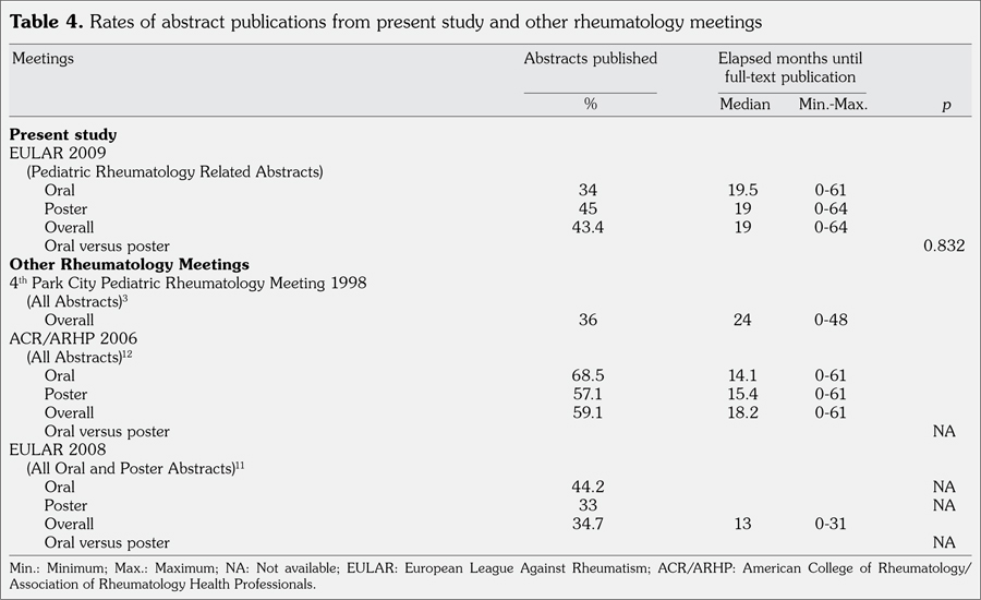 The rates reported in the present study seem higher than the first report of Hashkes et al.(3) about the publication rates of a pediatric rheumatology meeting. In the mentioned study, the authors investigated the abstracts of the 4th Park City Pediatric Rheumatology Meeting, which was held in 1998 in USA, and reported a publication rate of 36%. Over a four-year period after the meeting, the authors reported a median publication time of two years, which is longer than the results obtained in this study. In the light of the present results, we may suggest that the productivity of pediatric rheumatology has been increasing since then. This may be related to the increasing number of rheumatology journals where authors can find place for their manuscripts and increase the overall quality of work.