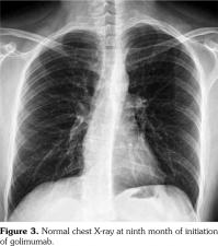 Tumor necrosis factor-alpha plays a role in forming the inflammatory granuloma. Anti-TNF-α therapy is considered to treat sarcoidosis by blocking TNF-α action.(10) Paradoxically, sarcoidosis cases developing during anti-TNF-α treatment have been reported.(10,11) This conflicting issue has not been clarified yet. Etanercept, infliximab, and adalimumab were found to be the most common agents, respectively, to be responsible for this condition.(10) In most of the cases in which sarcoidosis developed, etanercept emerged as the responsible anti-TNF-α agent.(11) However, although scarce, there are some case reports related with infliximab and adalimumab.(11) The reason of this issue may be the different molecular structure of etanercept.(10-12) Etanercept is a soluble receptor fusion protein.(13) TNF-α inhibition by etanercept is limited,(10-12) since it binds only to soluble TNF-α. Limited blocking of TNF-α by etanercept can lead to redistribution of TNF-α in low-concentrated regions like lungs.(10) Nonetheless, since sarcoid- like reactions have also been reported during the treatment with monoclonal anti-TNF-α agents like infliximab and adalimumab, other mechanisms should also be considered. Infliximab is a chimeric monoclonal antibody directed against TNF-α. Adalimumab is a recombinant fully human monoclonal antibody against TNF-α. Golimumab is a human immunoglobulin G1 kappa monoclonal antibody specific for TNF-α.(13) They bind to both soluble and membrane bounded TNF-α molecule. However, etanercept targets soluble TNF-α distinctly. Anti-TNF-α agents can change the cytokine environment. Etanercept can reinforce T-cell production of interferon gamma; furthermore, monoclonal anti-TNF-α antibodies can increase T helper 1: T helper 2 ratio which enhances interferon gamma production. Activated interferon gamma production, an important cytokine in granuloma formation, may contribute to the tendency to develop sarcoid-like reactions. Besides, these granulomatous reactions mainly occur in the lungs which was the case in our patient, and/or the skin, which are both exposed to exogenous antigens. In patients under anti-TNF-α treatment, some infections such as Mycobacterium tuberculosis and Propionibacterium acnes can trigger granuloma formation.(4)