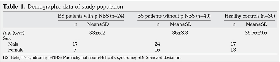 Study participants were grouped as p-NBS patients, BS patients without p-NBS, and healthy controls. Parenchymal NBS was defined as meningoencephalitis with or without spinal lesions. BS patients without p-NBS were then sub-grouped according to their type of involvement such as mucocutaneous, posterior uveitis, and vascular involvement group. Mucocutaneous involvement included patients with oral and genital ulcers, papulopustular lesions with or without arthritis. Vascular involvement included patients with deep venous thrombosis, cerebral venous sinus thrombosis, and pulmonary vascular thrombosis.