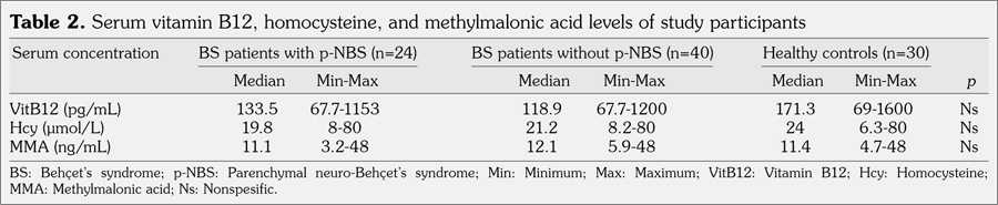 Patients and methods: Serum VitB12, Hcy, and MMA were measured using enzyme-linked immunosorbent assay in 64 patients (36 males, 28 females; mean age 36±8.3 years; range 20 to 56 years) who met the criteria of the International Study Group for Behçet’s Disease and 30 matched healthy controls (17 males, 13 females; mean age 35.76±9.6 years; range 20 to 50 years). The study participants were grouped as BS patients with NBS, BS patients without NBS, and healthy controls.