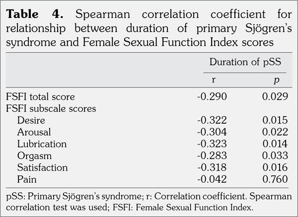 In the correlation analysis, FSFI total and subscale scores, except for pain, were found to be negatively correlated with duration of pSS; in other words, as disease duration increased, FSFI scores showing female sexual function decreased (Table 4).
