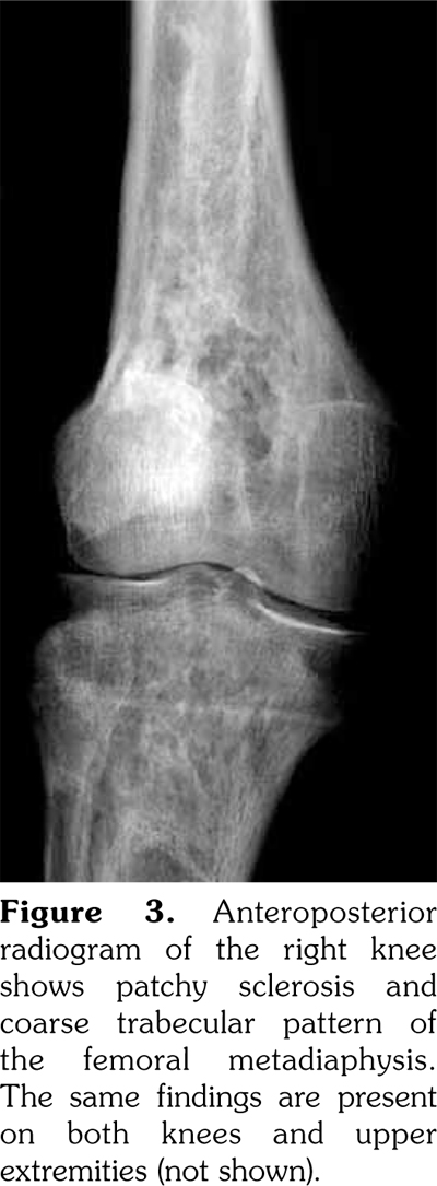 The X-ray changes that are considered to be pathognomonic and found in almost all patients are dia-metaphyseal osteosclerosis bilaterally and symmetrically in the tubular bones of upper and lower extremities.(5) They also show an increased uptake of tracer on Technetium 99m bone scintigraphy.(4) These bone changes may be misdiagnosed as Paget’s disease, lymphoma, sarcoidosis, metastases, or lipid storage diseases.(6,7)