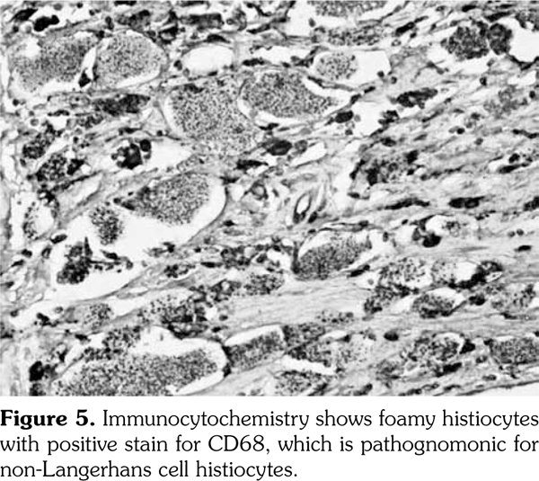 The final and definite diagnosis was confirmed with pathological evaluation of the nephrectomy specimen. The typical non- Langerhans' foamy histiocytes that lacked Birbeck granules, located in a polymorphic granuloma with xanthogranulomatosis was shown. Immunohistochemical staining revealed CD68(+), CD1a(-), and S-100 (-).