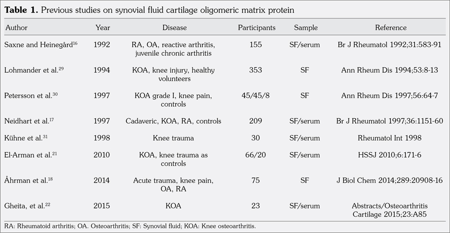 A limited number of studies have been found in the literature related to the analysis of COMP levels in SF and/or comparing levels of COMP between SF with serum.(16-18) In those studies, a high level of COMP was detected in both fluids, showing higher concentrations in SF than in serum indicating preferential release from the affected joints (Table 1).