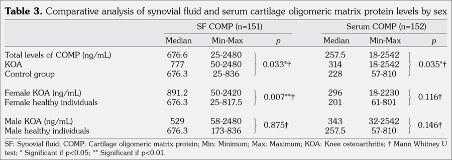 Results: Total synovial fluid cartilage oligomeric matrix protein levels were considerably higher than total serum levels for both groups. Levels of cartilage oligomeric matrix protein in synovial fluid and serum were higher in patients than in controls for both sexes. However, only cartilage oligomeric matrix protein levels in synovial fluid were higher in female patients. The levels of synovial fluid cartilage oligomeric matrix protein were significantly higher when sampling after 12 pm. A positive correlation was found between synovial fluid and serum cartilage oligomeric matrix protein levels, age, and daytime sampling.