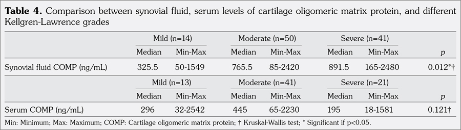 Patients and methods: One hundred and twenty-four individuals (44 males, 80 females; median age 66 years; range 42 to 87 years) were diagnosed with primary knee osteoarthritis according to the American College of Rheumatology guidelines. Additionally, 105 healthy healthy individuals (49 males, 56 females; median age 50 years; range 30 to 75 years) were included as the control group. For both groups, a thorough clinical history and physical examination were performed. Moreover, weight-bearing anteroposterior and lateral bending 30 degrees knee X-rays were collected. Cartilage oligomeric matrix protein in serum and synovial fluid was measured by enzyme-linked immunosorbent assay.
