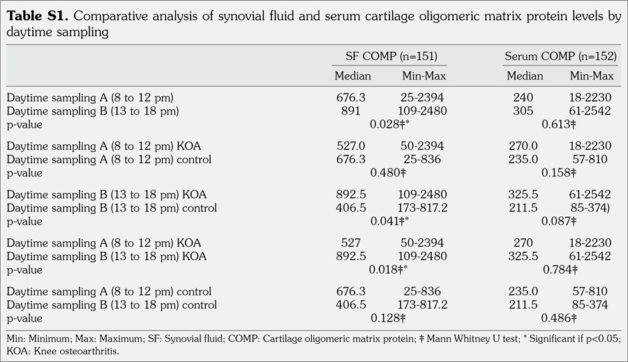Daytime variation is also an important issue to be considered as the influence of associated activity may modify levels of biomarkers. It has been reported that serum COMP levels remain constant during normal daytime activities (between 8 am and 9 pm) and it is not necessary to standardize the time of serum sampling.(26) Andersson et al.(27) reported that levels of serum COMP may be affected by exercise, especially during the first 30 minutes. Therefore, serum samples for COMP analysis should be drawn after at least 30 minutes of rest. However, the authors concluded that changes in serum levels of COMP are minor and do not compromise the utility of serum COMP as a biomarker. Although authors have demonstrated daytime variation in some related biomarkers in serum and urine,(28) we did not find a modification in serum COMP levels. However, the importance of diurnal variation of COMP levels in SF has not been fully addressed in the literature. In our study, only SF showed a significant increase in COMP levels after 12 pm when comparing groups (mainly in the KOA group), highlighting the importance to consider daytime variation of COMP levels in this biologic fluid to avoid false diagnosis.