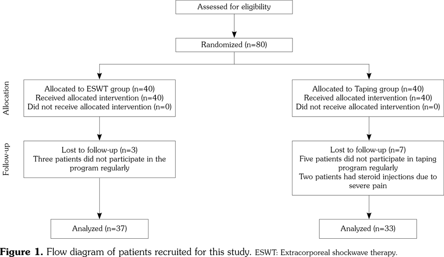 We conducted this randomized clinical trial with a follow-up for five weeks at Konya Training and Research Hospital Outpatient Clinic of Physical Medicine and Rehabilitation Department between November 2015 and February 2016. A total of 99 consecutive patients with plantar heel pain were screened for admission into the trial. Of them, 19 consecutive bilateral PF patients were not considered. Thus, 80 patients satisfied the eligibility criteria and were randomized into two groups as ESWT and KT groups (Figure 1). In the ESWT group, three patients did not appear for their assigned treatment regularly; therefore, the group included nine males and 28 females (mean age 47.8±12.4 years; range 40 to 55 years). In the KT group, five patients did not appear for their assigned treatment regularly, and two patients received steroid injections due to severe pain; therefore, the group included seven males and 26 females (mean age 47.7±9.8 years; range 40 to 55 years). The diagnosis of PF was based on tenderness localized to the medial tubercle of the calcaneus, and pain that started with the first step in the morning and worsened with weight-bearing activity. Assessments were performed before the procedure and at five-week follow-up visit. The following inclusion criteria were used: pain (i) was reported with palpation of the plantar fascia, (ii) was localized and sharp but not radiating, (iii) was worse with the initial step after an extended period of rest, and (iv) decreased initially after the first few steps but exacerbated with increased activity.(13) Exclusion criteria comprised (i) history of previous steroid injections, (ii) previous foot surgery, lumbar spine disc herniation or back injury, or (iii) history of rheumatic disease. The study protocol was approved by the Medical Faculty of Selçuk University Ethics Committee. A written informed consent was obtained from each patient. The study was conducted in accordance with the principles of the Declaration of Helsinki.