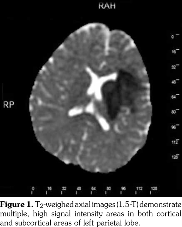 A great majority of patients recover from HSP completely, nevertheless, the condition may be associated with several rare complications. Although headache and behavioral changes are seen in many patients, severe neurological complications such as seizures, intracerebral hemorrhage, hemiplegia, and encephalopathy have also been reported albeit rarely during the course of HSP.(1,2) Polyarteritis nodosa should be considered as a possible diagnosis in patients with HSP who have an unusual course, especially in patients presenting with severe neurological complications. Our patient admitted with hemiplegia and polyarteritis nodosa was ruled out with renal angiography. The diagnosis of cerebral vasculitis may be difficult since the underlying neurologic abnormalities in HSP may have a multifactorial etiology. It has been reported that concomitant occurrence of hypertension, uremia, metabolic abnormalities and, corticosteroid treatment might contribute to the neurologic manifestations.(7) Our patient was normotensive and his serum chemistry was normal. Therefore, we could rule out the possibility of uremic and hypertensive encephalopathy. Garzoni et al.(4) reported that without severe hypertension, the most frequent neurologic manifestations of patients with HSP are altered level of consciousness in 54%, convulsions in 40%, focal neurologic deficits in 26%, visual abnormalities in 22%, and verbal disability in 10% of patients. Our patient admitted with hemiplegia and aphasia together. Neuroimaging results of cerebral lesions with central vasculitis in patients with HSP have been reported to be normal in 14%. The most frequently reported lesions were ischemic in 43% and hemorrhagic in 33% of the patients.(7,8) Ischemic lesions are usually multiple, but if there is a single vascular cerebral ischemia, the middle cerebral artery is mostly affected, like in our patient. A review of the literature indicates that neurologic symptoms usually develop less than two weeks after the onset of HSP.(8) Our patient was diagnosed on the 15th day of the disease.