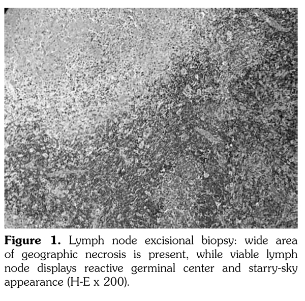 Bone marrow trephine biopsy showed slightly hypocellular marrow for the patient’s age, with trilineage hematopoiesis. Cervical lymph node excision was performed, which showed large areas of geographic necrosis with prominent nuclear debris and sheets of plasmacytoid dendritic cells. The background consisted of histiocytes, lymphocytes, and few eosinophils. The residual lymph node showed reactive germinal centers and tingible body macrophages, but no hemophagocytosis (Figure 1). These findings were consistent with necrotizing lymphadenitis of KFD. During the course of investigations, the high grade daily spiking fever persisted for twelve days and then resolved by itself.