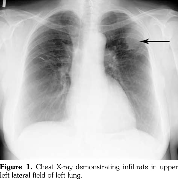 During each subsequent monthly hospitalizations, the patient remained in good general condition, the proteinuria and creatinine serum levels were within normal range. At one of the follow-up visits, nearly one month after the fifth pulse of cyclophosphamide, the patient reported thickening of the right breast, dry cough, and weakness. Chest X-ray demonstrated infiltrative lesion in the upper left lung field (Figure 1). A mild anemia was found, while breast ultrasound confirmed presence of knobby changes in the right breast. Accordingly, the administration of the next cyclophosphamide pulse was postponed and the patient was referred for oncologic consultation. Within the oncology clinic, a needle biopsy of the breast lesion was performed, revealing no neoplastic cells and the histopathological image corresponding to infiltration in the course of granulomatosis with polyangiitis gathering mainly around small size blood vessels (Figure 2). On the basis of infiltrative changes in the lungs, the result of breast biopsy, and presence of anti-neutrophil cytoplasmic antibodies, the recurrence of the underlying disease was diagnosed. Accordingly, the prednisone dose was increased to 1 mg/kg with subsequent tapering to 15 mg/day. Thus a gradual decrease in C-reactive protein levels with improvement of the patient's condition was observed. After a few days, a pulse of intravenous cyclophosphamide (1000 mg) was administered. Following intensification of immunosuppressive therapy, patient’s condition improved, and normalization of serum C-reactive protein was noted. Following five weeks, a control chest X-ray demonstrated no lung infiltrations. Since then, two pulses of cyclophosphamide (1000 mg each, four weeks apart) were given and the treatment with azathioprine, 100 mg per day, has been started. Currently, the patient remains in complete remission.