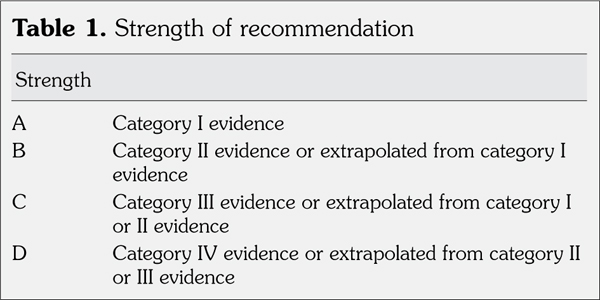 Level of agreement and strength of recommendation (SOR) were evaluated by Numerical Scale. SORs (Table 1 and Table 2) were categorized using the methodology according to 2014 update of the EULAR standardized operating procedures.(3)