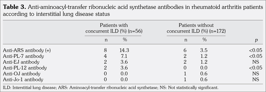 Patients and methods: We retrospectively studied the anti-ARS antibody levels in 228 RA patients’ (44 males, 184 females; mean age 62.9±14.0 years; range 23 to 88 years) sera from their medical charts. We determined the association with anti-cyclic citrullinated peptide antibody levels, interstitial lung disease (ILD), rheumatoid factor, and methotrexate or biological disease modifying antirheumatic drug treatments.