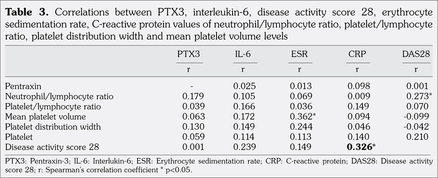 Results: Demographic characteristics were similar between the two groups, with no statistically significant difference in terms of sex, age, and body mass index (p>0.05). NLR, PTX3 and interleukin-6 levels were higher in patients with RA than the control group (p<0.05). While erythrocyte sedimentation rate had a positive correlation with mean platelet volume, we found no correlation between NLR and other parameters of disease activity, PTX3, and interleukin-6.