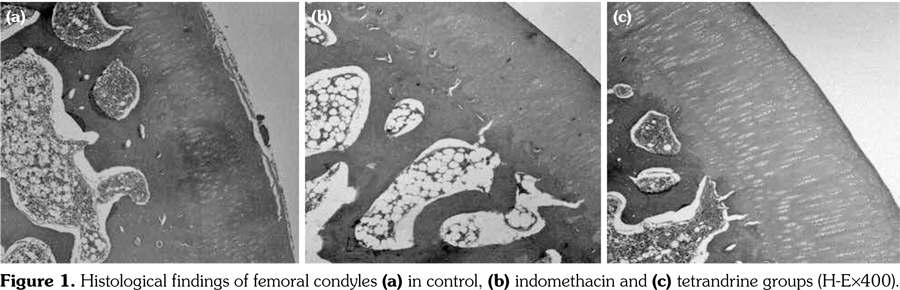 Specimens from the control group showed morphologic changes characteristic of OA. These changes included disarranged chondrocytes with degeneration or necrosis, ulcerations in the deep cartilage layer, and fibroplasia at the bottom of the ulcers (Figure 1a). In both the indomethacin and tetrandrine groups, histological changes associated with OA were clearly seen, but the severity was milder than in the control group (Figures 1b and c). Mankin scores in the indomethacin (2.94±0.98) and tetrandrine (2.85±0.74) groups were significantly lower than in the control group (6.45±1.23) (p<0.05), as seen in Figure 2. However, no significant differences between the indomethacin and tetrandrine groups were observed.