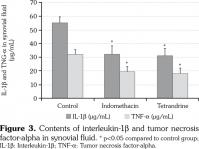 As shown in Figures 3 and 4, the levels of IL-1β, TNF-α and NO in the SF were significantly decreased in the indomethacin and tetrandrine groups compared with the control group (p<0.05), with no significant differences between the indomethacin and tetrandrine groups (p>0.05).