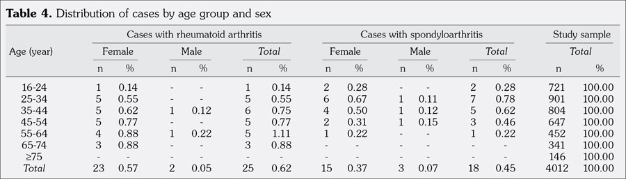 Our study has some limitations. Face-to-face interviews might have their own limitations such as encountering more females than males in households, since the labor force is overwhelmingly comprised of males in Turkey, rendering the females mostly homemakers. Accordingly, 58% of the individuals involved in our study were females whereas the national census performed in 2000 showed that females constituted 50% of Turkey’s population. The rate of females was even higher (61%) in the Northern region where the prevalence of RA was highest. This could be a bias for the higher prevalence of RA as it is known that RA is mostly seen in females. However, in the Lithuanian study in which the same methodology (by telephone) was used, the authors emphasized the same problem.(12) Another limitation of our study was not studying the HLA-B27.