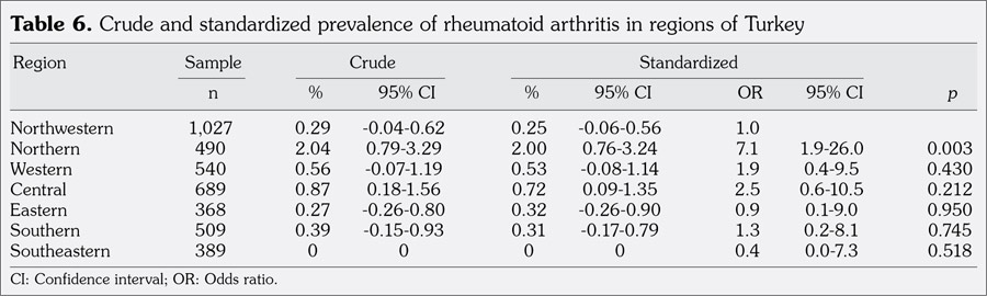 Our study indicates a prevalence of 0.56% for RA adjusted for the general population aged 16 or over. In previous studies, the prevalence of RA adjusted for the general population aged 20 or over of Turkey was estimated as 0.32%, 0.36%, 0.42% and 1.01% in Havsa, ‹zmir, Antalya and the eastern Black Sea region, respectively.(3,4,19,20) Those studies indicate that RA prevalence shows regional variations in Turkey. Indeed, our study has also shown that there are regional variations in the prevalence of RA. The prevalence of RA was highest in the Northern region (2.04%) and lowest in the Southeastern region (0%).
