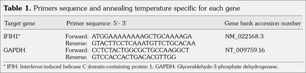 Interferon-induced helicase C domain- containing protein 1 gene quantitative assessment was performed by real-time polymerase chain reaction (RT-PCR) as follows: peripheral blood was obtained from SLE patients and healthy controls. Peripheral blood mononuclear cells were isolated by a Ficoll-Paque density gradient (Pharmacia Biotech, Uppsala, Sweden) to remove erythrocytes, platelets, and cell debris. Total ribonucleic acid (RNA) was extracted using QIAGEN RNeasy mini kit (Qiagen GmbH, Hilden, Germany). Reverse transcription was performed on deoxyribonuclease-treated total RNA. Complementary DNA was synthesized from messenger RNA with oligo(dT) primer and Superscript II Reverse Transcriptase (Invitrogen, Grand Island, NY, USA). Specific primers and probes were used in the RT-PCR assay (Table 1). RT-PCR was performed by One-Step Applied Biosystems RT-PCR (Foster City, CA, USA). The relative changes of IFIH1 human gene were analyzed by SYBR Green RT-PCR (StepOneTM, USA). Dissociation curve analysis was performed after each assay to ensure specific target detection.
