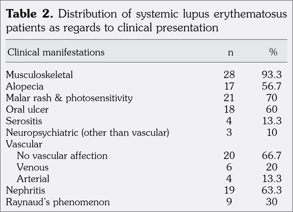 The most common presentations of SLE patients were musculoskeletal and mucocutaneous manifestations. The vascular affection was as follows: venous affection including one patient with dural sinus thrombosis, one patient with femoropopliteal deep vein thrombosis (DVT), and four patients with infrapopliteal DVT and tibial arteries affection as peripheral arterial disease in four patients.