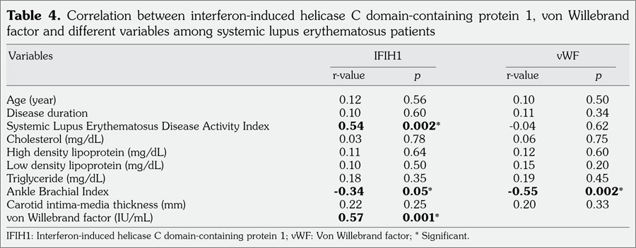 Patients and methods: The cross-sectional study included 30 consecutive SLE patients (2 males, 28 females; mean age 28±3.4 years; range 16 to 40 years) diagnosed according to the American College of Rheumatology revised criteria and 10 healthy age- and sex-matched controls (2 males, 8 females; mean age 27±2.5 years; range 22 to 23 years). SLE patients and controls were compared in terms of quantitative reverse transcriptase polymerase chain reaction gene expression of IFIH1 gene, von Willebrand factor, carotid intima-media thickness, and ankle brachial index.