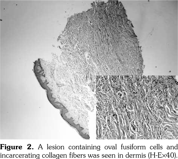 A 37-year-old female patient presented to our clinic with a four-month history of asymptomatic lesions on the torso and in the lower extremities. Patient history revealed that the patient had presented to a hospital five years earlier due to the complaints including photosensitivity, malar rash, oral aft, hair loss, fatigue, and arthralgia and had been diagnosed as having systemic lupus erythematosus (SLE) depending on the clinical signs and symptoms including an erythrocyte sedimentation rate of 83 mm/hour and positive antinuclear antibodies and anti-double stranded deoxyribonucleic acid. Subsequently, the patient had been initiated on methylprednisolone 64 mg/day and hydroxychloroquine sulphate 400 mg/day. For the last five years, the patient had been using systemic methylprednisolone and hydroxychloroquine sulphate at varying dosages. The patient had no history of trauma, injection, or insect bite. A skin examination revealed well- marginated, hard, black-brownish plaques varying in size between 1-2 cm, with three plaques on the anterior torso and six plaques on the extensor surface of the thigh and the leg (Figure 1). Histopathologic examination of a skin biopsy revealed a lesion containing oval fusiform cells and incarcerating collagen fibers was seen in the dermis (Figure 2). Depending on these sign and symptoms, the patient was diagnosed as having multiple eruptive dermatofibromas (MEDFs). No treatment was performed since the lesions resolved spontaneously.