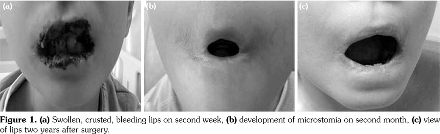 The child is being followed-up for two years and he did not develop any sign of other underlying chronic vasculitis or systemic sclerosis and has near normal mouth opening (Figure 1c). To the best of our knowledge, this is the first case of KD with extensive and severe lip and oral mucosa involvement complicated with microstomia.