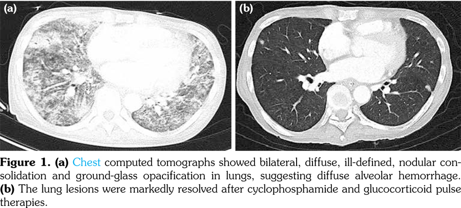 (Figure 2b). Plasma exchange and intravenous immunoglobulin therapy were performed with liposomal amphotericin B. However, her respiration was not improved and the endotracheal tube was frequently blocked because of persistent DAH. Notwithstanding the risk of the concurrent infection aggravation, cyclophosphamide and glucocorticoid pulse therapy were added for the management of the refractory DAH. Three cycles of cyclophosphamide pulse therapies (intravenous cyclophosphamide 500 mg with methylprednisolone 1 g) were administered with a surgical debridement of the nasal mucormycosis lesions on the 39th hospital day (Figure 2c). Her respiration stabilized and the lung lesion gradually resolved with the cyclophosphamide pulse therapies (Figure 1b). The patient eventually recovered after three months of intensive care unit care.