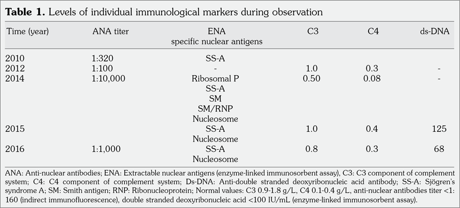 pain in peripheral joints. Physical examination of the motor system revealed tenderness and edema of small joints in both hands. Laboratory studies demonstrated mild leukopenia 3.7∞10(3)/uL (normal values 4-10∞10(3)/uL), reduced components of the complement system, and positive anti-nuclear antibody (Table 1). Systemic lupus erythematosus (SLE) was diagnosed based on the Systemic Lupus International Collaborating Clinics criteria.(3) Treatment with hydroxychloroquine (200 mg/day) was initiated with improvement. In 2016, the patient again experienced symptoms of fatigue; laboratory studies confirmed hypothyroidism and the presence of antithyroglobulin antibodies. Immunological studies showed increased anti- nuclear antibody titer (anti-Sjögren's syndrome A, anti-nucleosome) as well as slightly reduced levels of C3 component of the complement system. Clinical improvement was obtained after supplementation of thyroid hormones. As determined retrospectively, the patient was six weeks pregnant at the time, but miscarried in the first trimester.