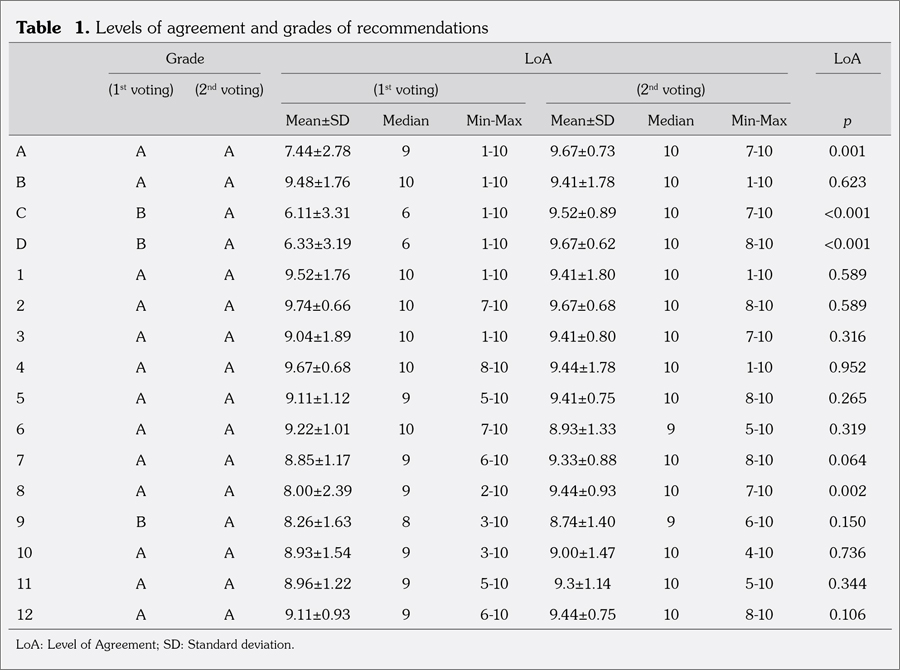 Patients and methods: The EULAR 2016 recommendations for the treatment of RA were voted by 27 specialists experienced in this field with regard to participation rate for each recommendation and significance of items. Afterwards, each recommendation was brought forward for discussion and any alteration gaining ≥70% approval was accepted. Also, Turkish version of each item was rearranged. Last version of the recommendations was then revoted to determine the level of agreement. Levels of agreement of the two voting rounds were compared with Wilcoxon signed-rank test. In case of significant difference, the item with higher level of agreement was accepted. In case of no difference, the changed item was selected.