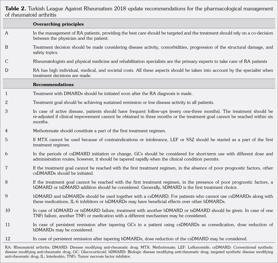 Results: Four overarching principles and 12 recommendations were assessed among which three overarching principles and one recommendation were changed. The changed overarching principles emphasized the importance of physical medicine and rehabilitation specialists as well as rheumatologists for the care of RA patients in Turkey. An alteration was made in the eighth recommendation on treatment of active RA patients with unfavorable prognostic indicators after failure of three conventional disease modifying anti-rheumatic drugs. Remaining principles were accepted as the same although some alterations were suggested but could not find adequate support to reach significance.