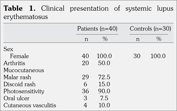 Of the 40 SLE patients, 20 (50%) presented with arthritis and 29 (72%) with malar rash. Six patients (15%) had discoid rash and 36 (90%) had photosensitivity. Three patients (7.5%) had oral ulcers while four (10%) had cutaneous vasculitis (Table 1). Disease duration ranged from 3 to 12 months with a mean of 3±3.2 (Table 2). SLEAI ranged from 22 to 28 with a mean of 14.1±9.3. Of the SLE patients, 21 (52.5%) had active lupus nephritis (Table 3) while 25 (62.5%) were dyslipidemic (Table 4).