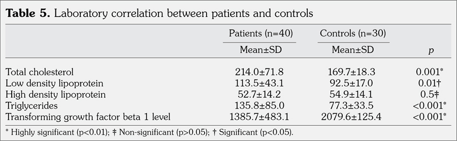 Mean serum TGF-β1 level of SLE patients was 1385.7±483.1 pg/mL with a significant difference compared with the control group (2079.6±125.4 pg/mL; p<0.001). There was a statistically significant difference in total serum cholesterol, LDL, and serum triglyceride levels between SLE patients and controls, with higher levels in the first group (p values of 0.001, 0.01, and <0.001, respectively) (Table 5).