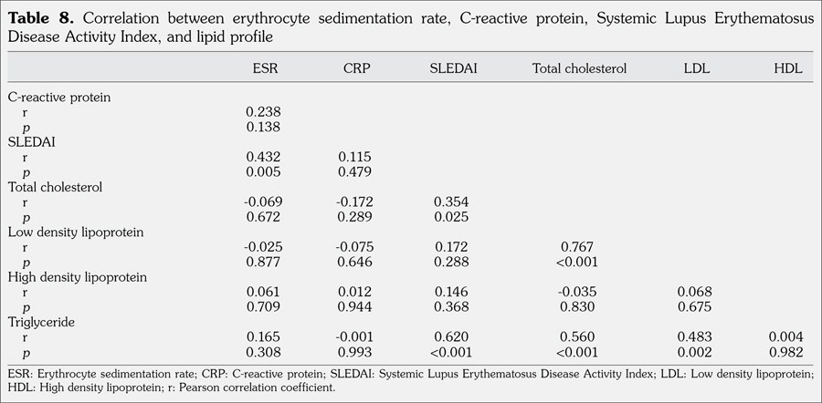 Systemic Lupus Erythematosus Disease Activity Index was statistically significantly correlated with erythrocyte sedimentation rate, serum cholesterol, triglyceride, and deoxyribonucleic acid levels (p values of 0.005, 0.025, 0.001, and 0.002, respectively) (Table 8). Deoxyribonucleic acid was statistically significantly correlated with disease duration, C3, C4, and 24-hour urinary protein (p values of 0.003, 0.001, 0.013, and 0.008, respectively) (Table 9).