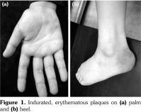 A 10-year-old female patient presented with a two- week history of violaceous eruptions with swelling on the palm and heel (Figure 1a and b). The lesion was exceedingly painful; hence, she could not walk without assistance and had functional limitation on daily practice, such as grasping a pencil. She had no significant personal or family history. The patient also had mild reddish and scaly rashes on her elbows, which were not painful, and she could not recall when they appeared. She underwent a cutaneous biopsy on the heel, and laboratory assessments and imaging tests were performed. The patient was initially treated with antibiotics because we could not exclude an infectious origin, such as cellulitis. A written informed consent was obtained from the patient.