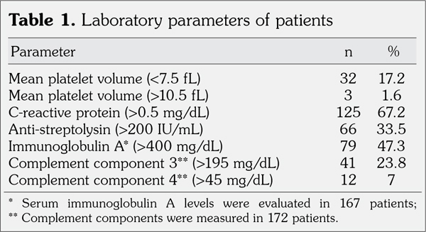 Male/female ratio of patients was 1.08. Thirty patients (16%) were >10 years. Mean MPV value was 8.2±0.88 fL (range, 5.7 fL-11.1 fL). Decreased MPV levels were detected in 32 (17.2%) and increased MPV levels were detected in three patients (1.6%). Increased CRP and ASO were detected in 125 (67.2%) and 66 patients (35.5%), respectively. Serum IgA levels were evaluated in 167 patients and in 79 (47.3%) of them, the levels were higher than the normal range. Complement components were measured in 172 patients. C3 and C4 levels were higher than normal in 41 (23.8%) and 12 patients (7%), respectively. Decreased C3 and C4 levels were not observed in any patient. Laboratory findings were summarized in Table 1.