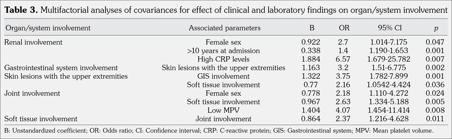 Results: Logistic regression analysis revealed that the risk of gastrointestinal system involvement was significantly higher in patients with skin lesions in the upper extremities (p=0.002, odds ratio [OR]=3.2). The risk of joint involvement was significantly higher in girls (p=0.024, OR=2.18), in patients with soft tissue swelling (p=0.005, OR=2.63), and with low mean platelet volume levels (p=0.008, OR=4.07). The risk of renal involvement was significantly higher in girls (p=0.047, OR=2.7), in patients >10 years (p=0.001, OR=1.4), and in patients with elevated C-reactive protein levels (p=0.007, OR=6.57).